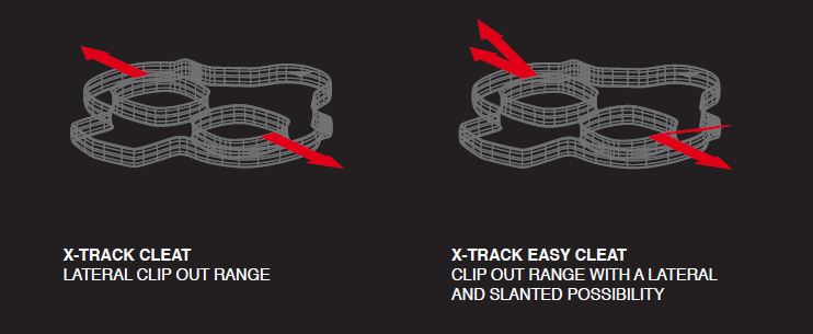 Two cleat models are available for the X-TRACK RACE and X-TRACK EN-RAGE range. The X-TRACK CLEAT is a standard version which allows a standard lateral clip out. The X-TRACK EASY CLEAT offers a larger clip out range with a lateral and angled release possibilities. By choosing the right cleat you can adapt your pedal performance to your needs and practice.