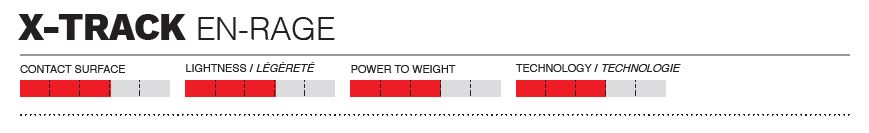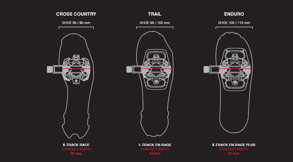 The X-TRACK EN-RAGE pedal, again made of aluminium, but has a narrower body. It is 63 mm wide for 554 mm ² of contact surface area, making it a lighter pedal. This narrower profile makes it more at home in narrow and steep single track. While still ENDURO capable, it is mainly intended as a TRAIL pedal.