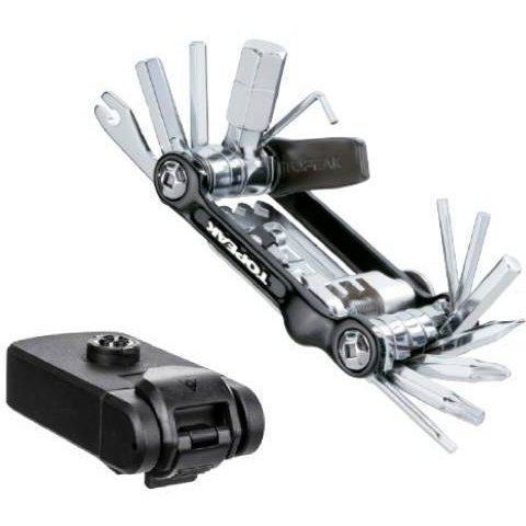 - TOOLS2-L / 2.5 / 3 (2 pcs) / 4 / 5 / 6 / 8 / 10 mm Allen, T10 / T25 Torx, #2 Phillips / Flat head, 14G / 15G / Mavic® M7 / Shimano® spokes, CrMo steel chain tool*, Stainless steel wire chain hook, Super hard anodized tire lever, Bottle opener with spoke holder