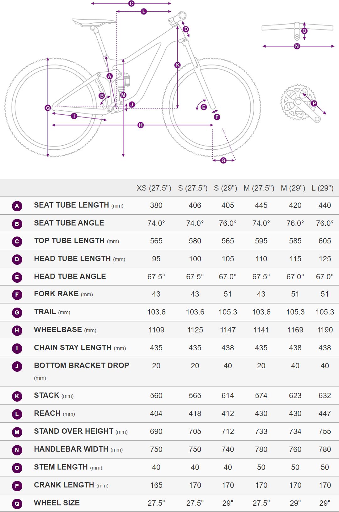 - Crankset: SRAM SX Eagle DUB, 30t For 27.5: XS:165mm, S:170mm, M:170mm For 29: S:170mm, M:170mm, L:170mm