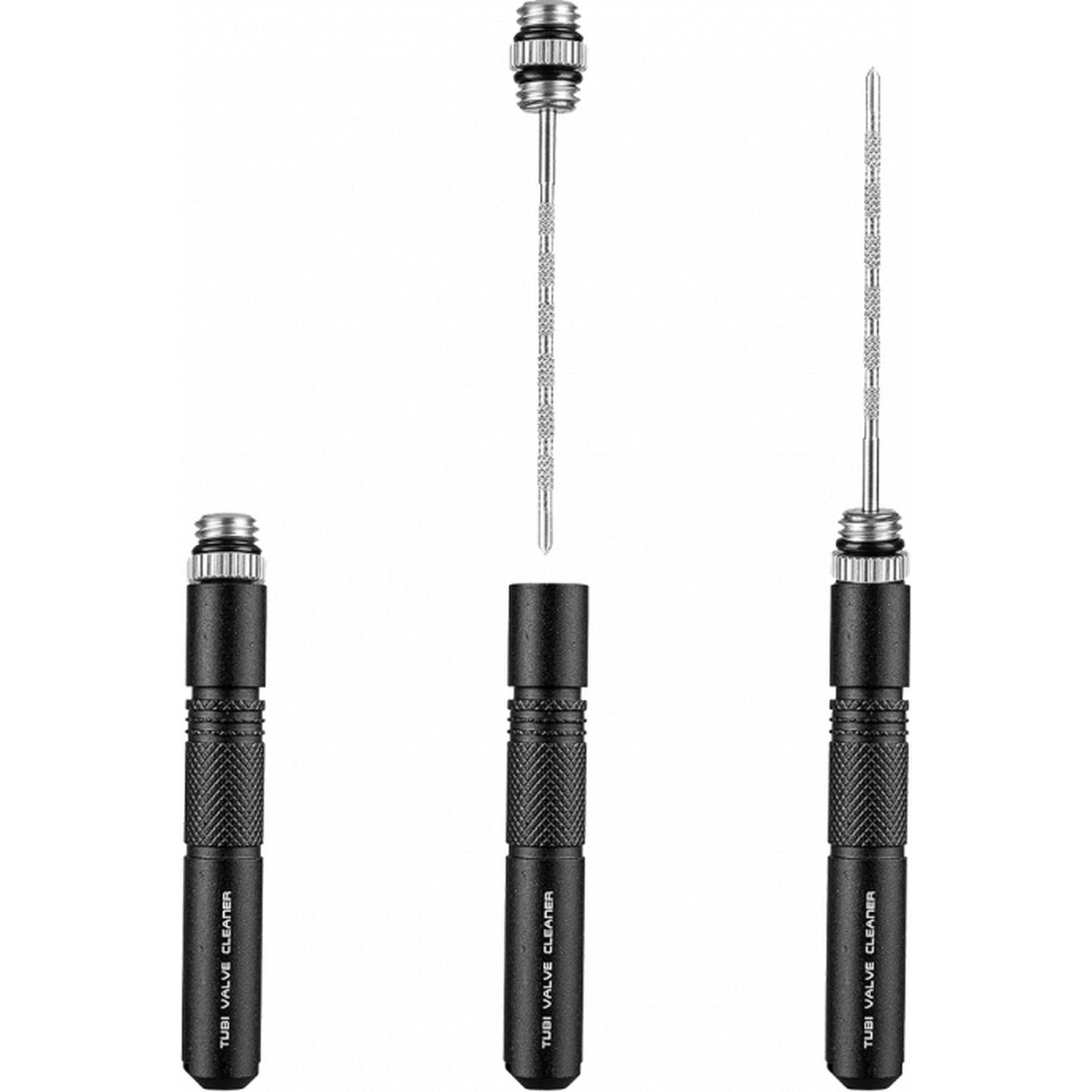 Precision CNC machined aluminum Tubi Valve Cleaner allows to remove or tighten two-piece Presta valve core and clear tire sealant clogs from valve stem for tubeless tire maintenance. Compact size easily fits in a jersey pocket or saddle, or mount with TubiPod Max for a ride.