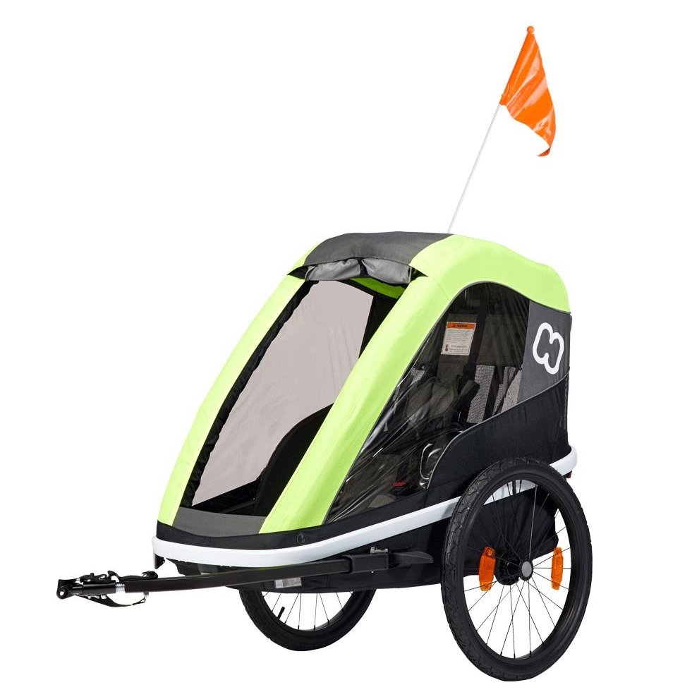 The Avenida Double and Single models both include a bicycle attachment arm and stroller wheel.