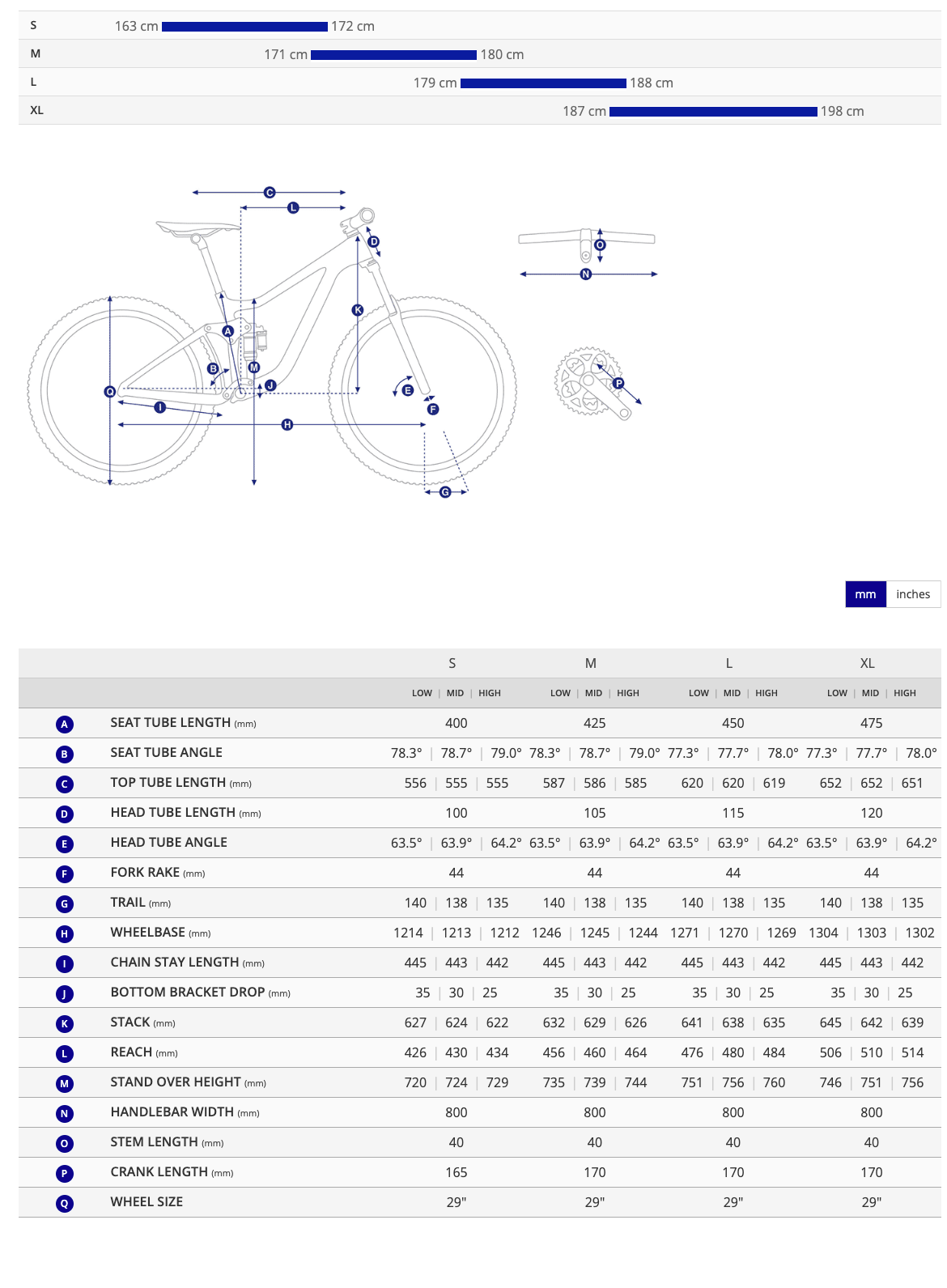 - You can select a 63.5, 63.9 or 64.2-degree head angle and corresponding 78.3, 78.7 or 79-degree seat tube angle, resulting in a 35, 30 or 25mm bottom bracket drop (size medium) to fine-tune handling for trail conditions, riding style and rear-wheel size.