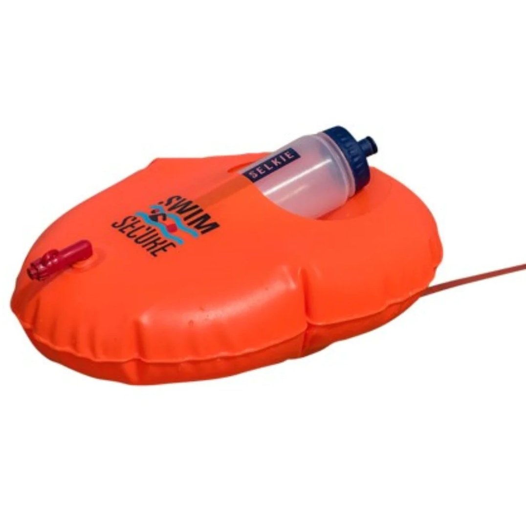 A highly visible tow float with waist strap and an open top slot for bottles up to 750ml. The floor of the float inflates, with a drain hole, so that any water going into the float self drains. Ideal for swimmers that want to put in a long training swim but stay hydrated while in the water.