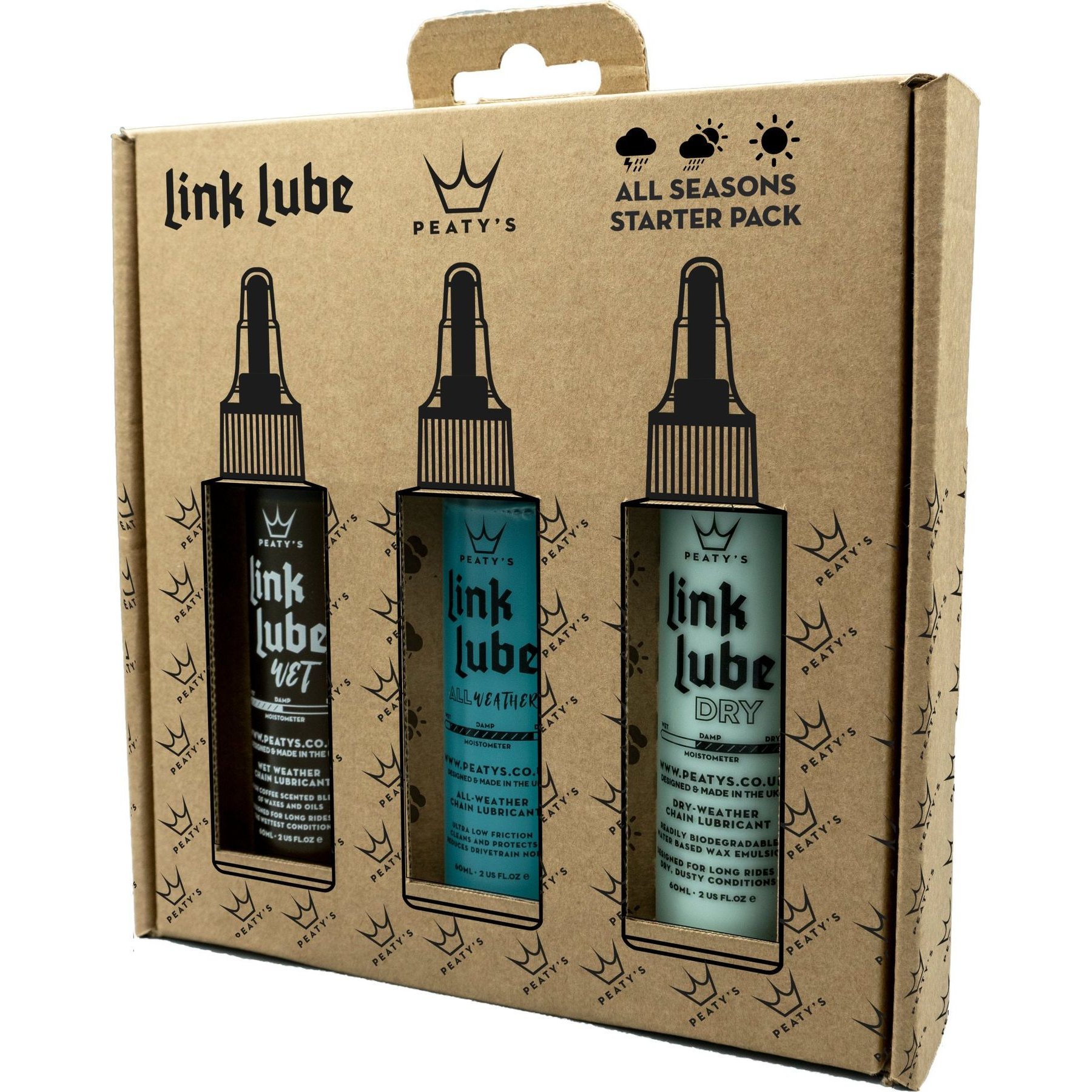 The LinkLube All Season Starter Pack contains one 60ml Bottle of Dry, All Weather and Wet LinkLube so with one purchase you'll be covered for riding in all season and any weather condition.
