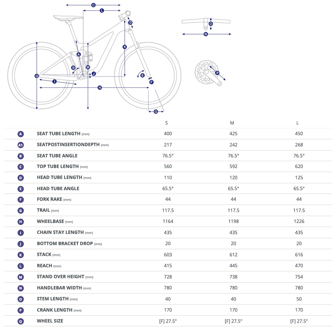 - Crankset: Shimano CUES FC-U6000-1, 32t S:170mm, M:170mm, L:170mm