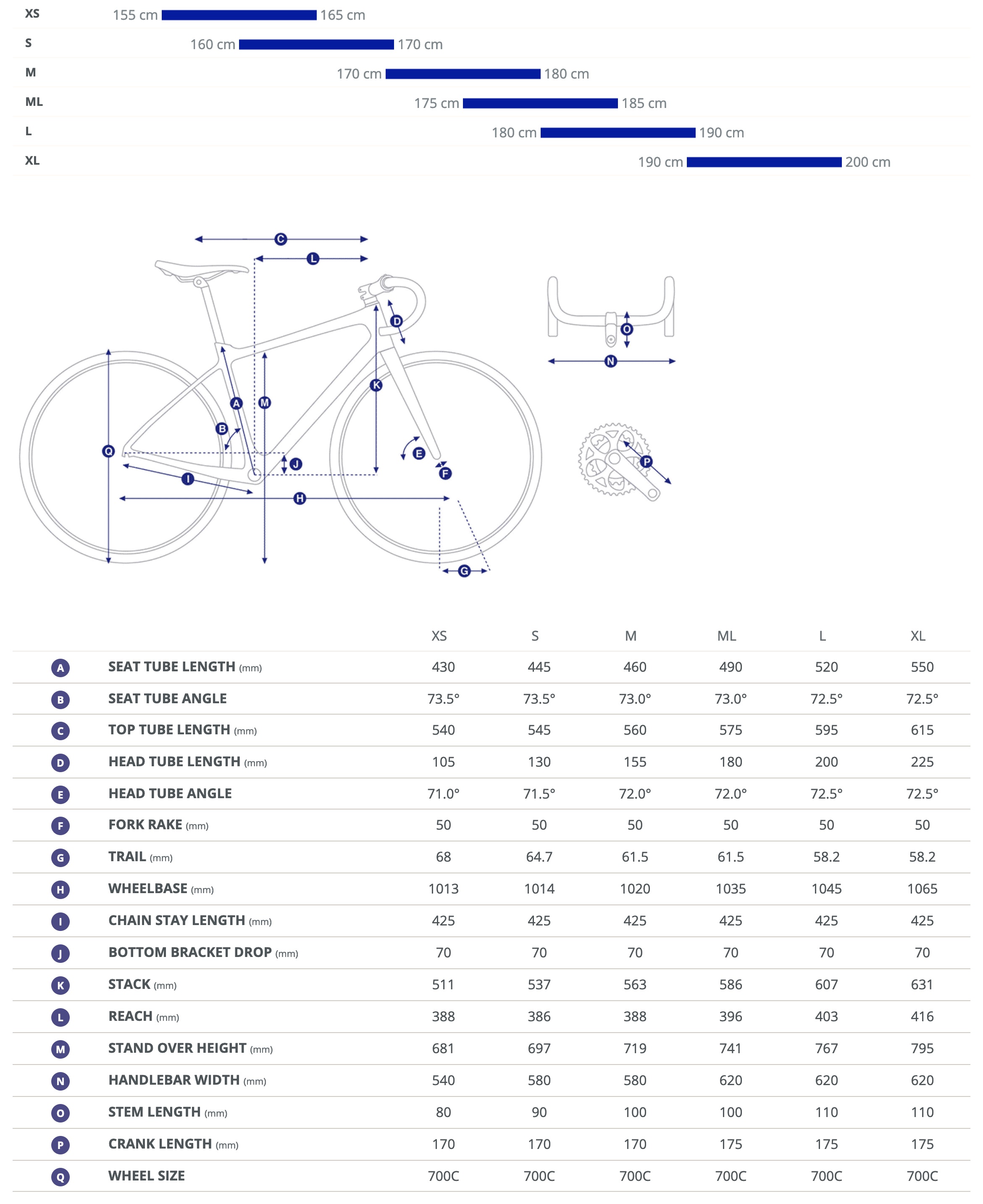 - Crankset: FSA Omega, 32/48 XS:170mm, S:170mm, M:170mm, M/L:172.5mm, L:172.5mm, XL: 172.5mm