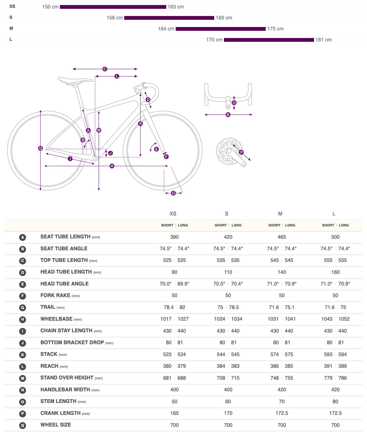 - Crankset: FSA Omega Adventure, 32/48 XS: 165mm, S: 170mm, M: 172.5mm, L: 172.5mm