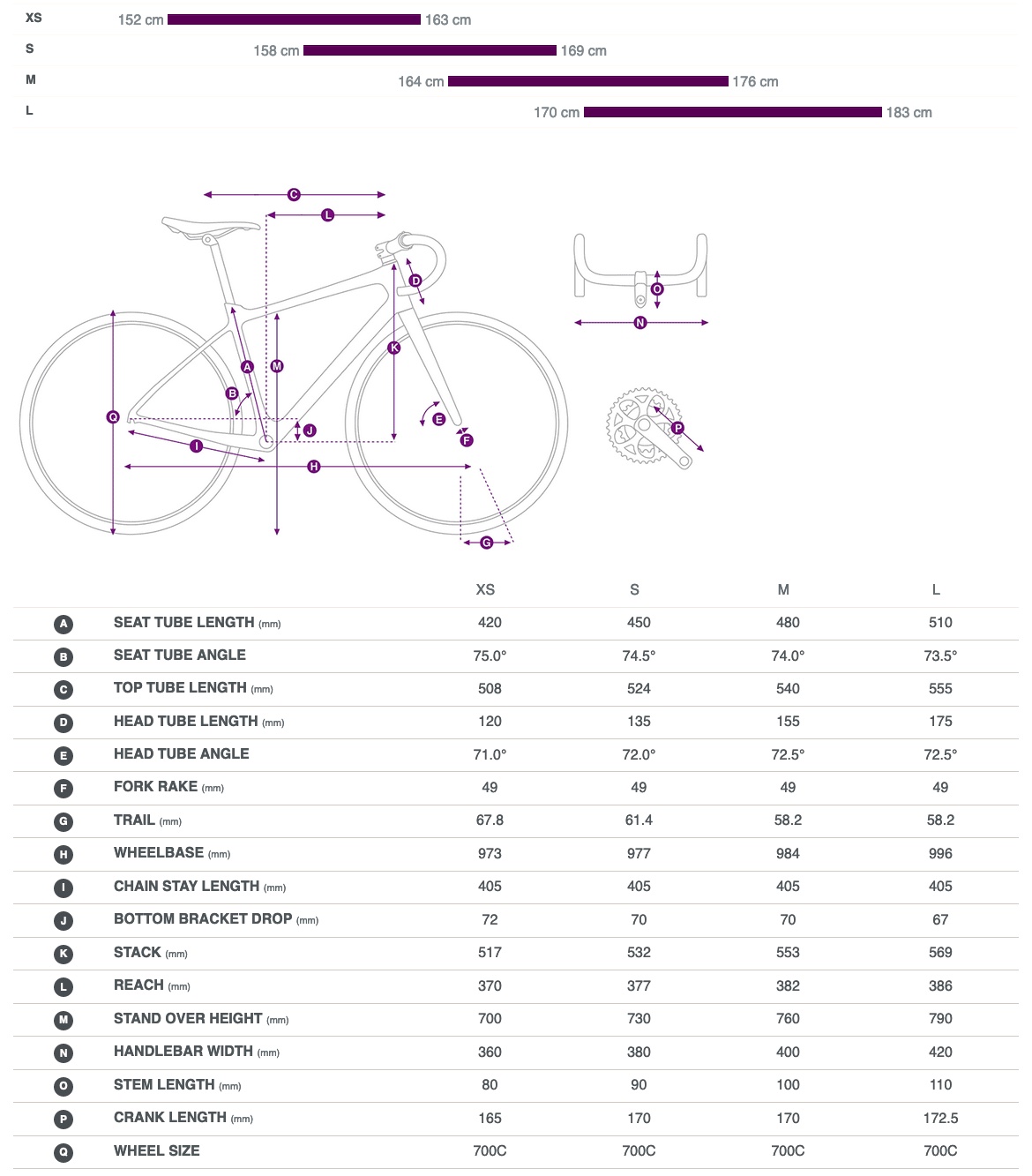 - Crankset: Shimano 105, 36/52 XXS: 165mm, XS: 165mm, S: 170mm, M: 170mm, L: 172.5mm