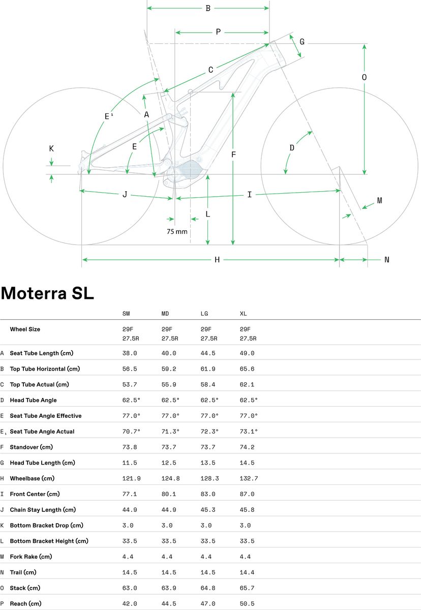 - Frame: Moterra SL, Series 1 Carbon construction, 150mm travel, Proportional Response Tuned Suspension, FlexPivot Chainstay, direct mount internal battery, engineered plastic skid plate, 55mm chainline, DirectLine internal cable routing, 29” FlipChip, 148x12mm Maxle thru-axle, UDH hanger, 200mm native post mount brake, 1-1/8” – 1.5” tapered headtube, angle adjust headset