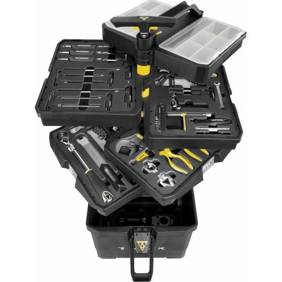 Easy moving trolley with six tool compartments containing 52 professional quality bike tools. Wheel base can be easily pulled out to extend working base for better stability. Aluminium handlebar can be folded and locked in position for easy hand carrying to car or van. Unlock and extend handle to wheel tool station around. Perfect for bike shops, race events, or home bike maintenance