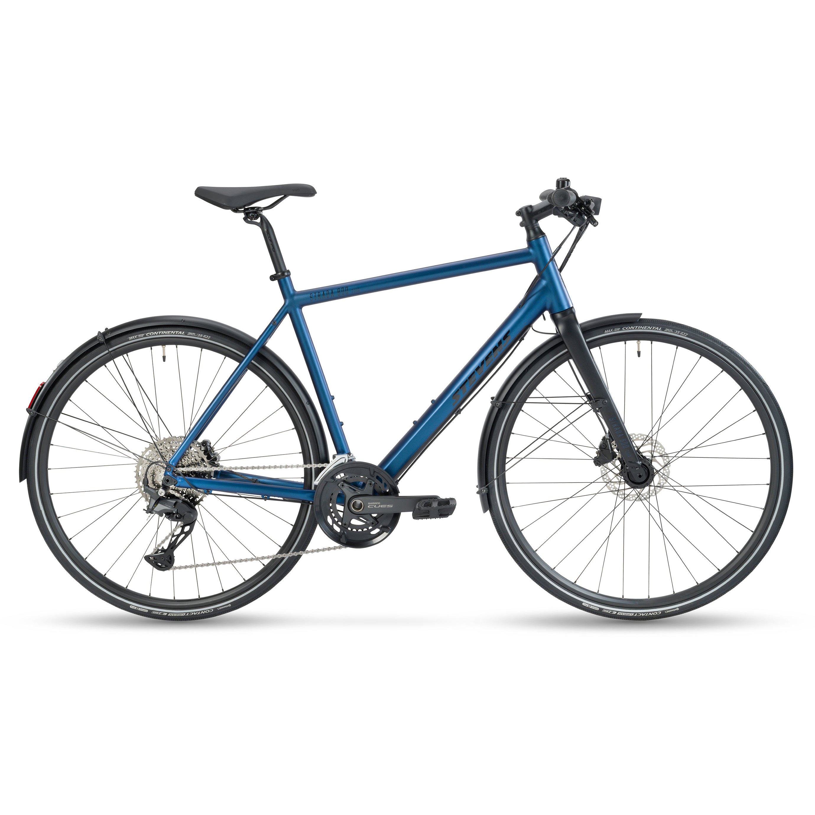 The STEVENS Strada 800 Tour is a real "wolf in sheep's clothing" on two wheels: Under its "sheepskin" – a high-quality all-season equipment from the hub dynamo to full mudguards to the nobly bright Supernova headlight – is an urban racer in a class of its own. Its stiff frame and S-Lite aluminium fork combine to impress with agile, precise handling. The long-lasting Shimano CUES U6000 Linkglide 2x11-speed drivetrain converts pedal power into a stormy forward thrust – adequately kept in check by hydraulic flat-mount disc brakes.
