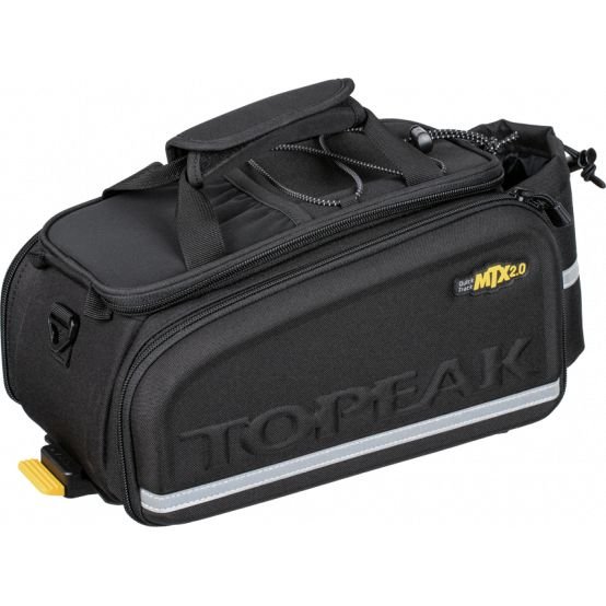 Large capacity MTX TrunkBag containing one main divided compartment with two expandable pannier side panels and rear water bottle holder. Our unique construction process provides rigidity and water repellency. Compatible with all MTX QuickTrack® racks with attached side frames. MTX Dual Side Frames are required when using side panniers on MTX BeamRacks.