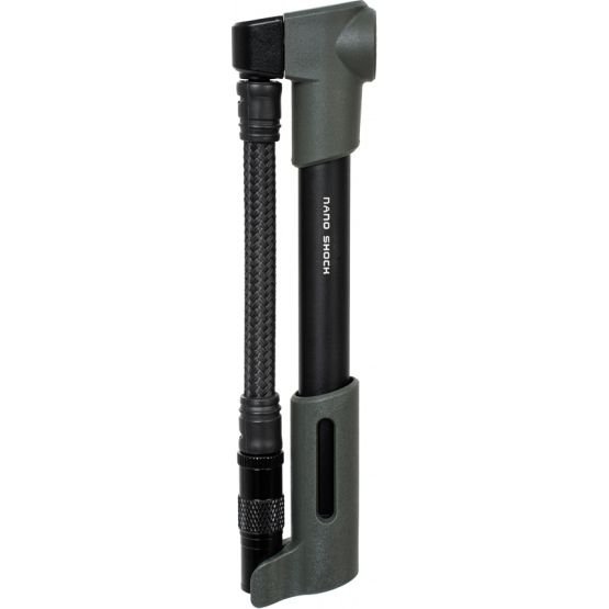 Ultra-lightweight shock pump with a 360° rotatable, braided hose, perfect for storing in your cycling jersey or a small bag, ready to take with you wherever you go.
