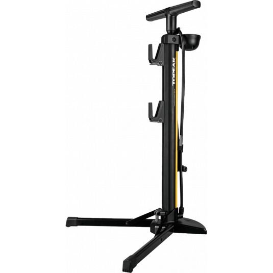 Stable and portable bike stand/floor pump combo for maintenance and storage of your bike. An extra-long pump hose reaches the front wheel easily. It features QR levers speed positioning of frame hooks to fit chainstays / seatstays and provide rear wheel lift. Non-marring rubber frame hooks won’t harm bike’s finish and the stronger, larger base adds stability that’s perfect for e-Bikes, heavy weight bikes, and larger bike frames. This compact and dual function design stand/pump is the perfect assistant for your bike storage and repair/maintenance needs.