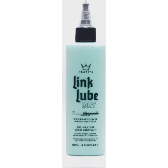 LinkLube Dry is a readily biodegradable, wax-based chain lube for use in desert dry and dusty, to mildly moist conditions. Our unique formula uses a blend of waxes suspended in a water-based emulsion to give you a long-lasting, clean-running, quiet chain.