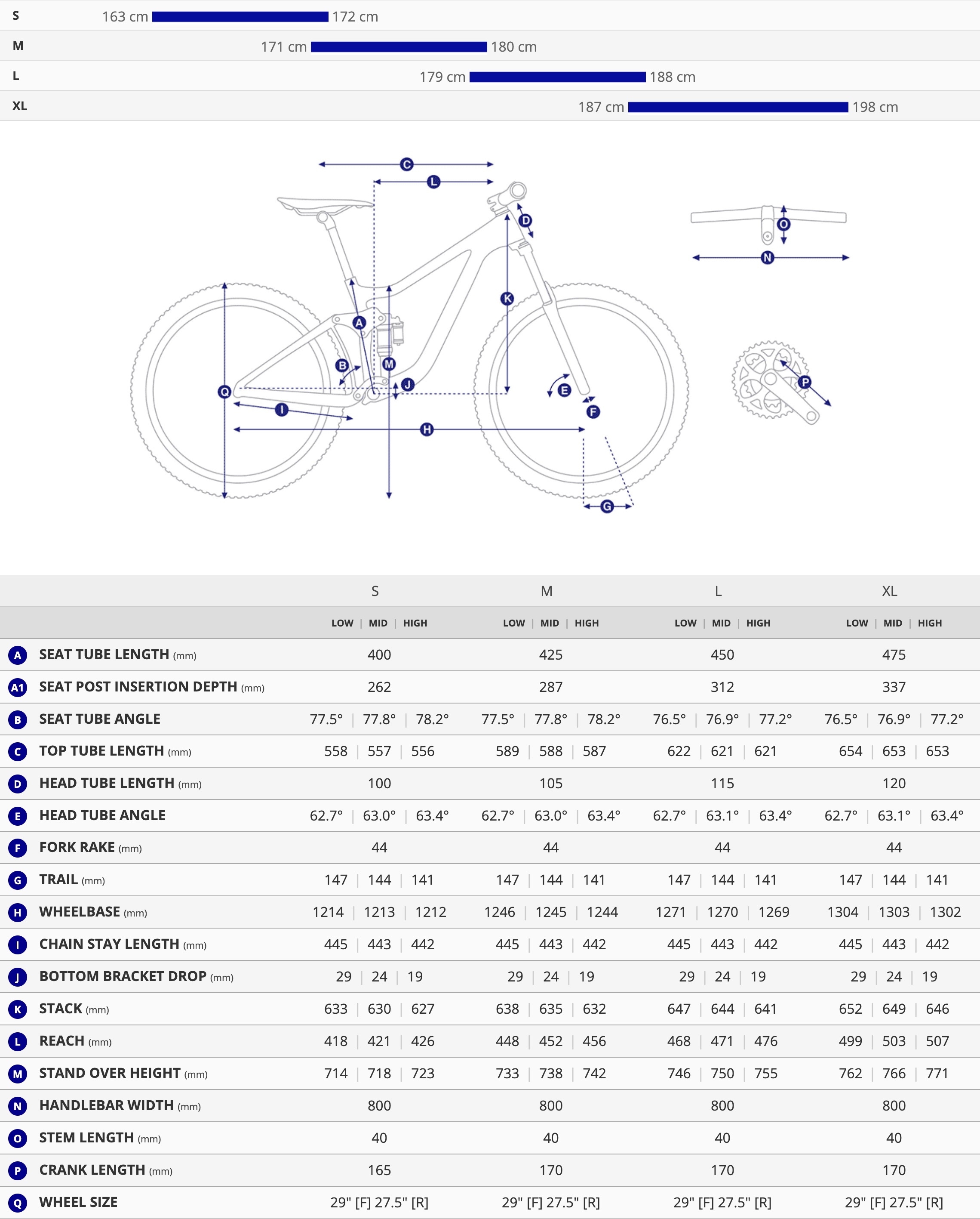 - Adjustable enduro geometry: Flip chip technology lets you switch between three settings depending on the terrain. You can select a 62.47, 63.09 or 63.46-degree head angle and corresponding 77.54, 77.89 or 78.26-degree seat tube angle, resulting in a 29, 24 or 19mm bottom bracket drop (size medium) to fine-tune handling for trail conditions, riding style and rear-wheel size.