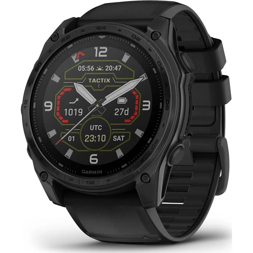 Rise above with tactix 8. It’s the ultimate tactical smartwatch, featuring a solar charged display, titanium bezel, sapphire lens, an internal speaker and mic for voice features and a 40-metre dive rating.