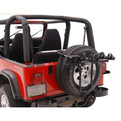 Durable yet simple design allows fast installation or removal with a rugged strap system. Fully adjustable to fit most rear spare tires, this rack's support arms can be centered for side-mounted tires, and folded when not in use. Carries two bikes, comes fully assembled and folds flat for storage.