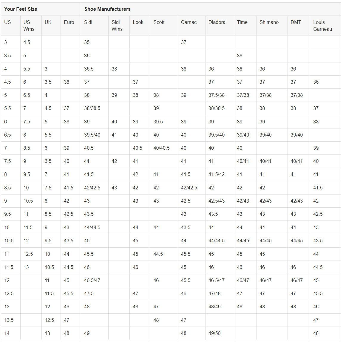 Despite a unified shoe-size measure, size can vary as much as 1 or more units from maker to maker or even model to model. The number on the shoe is not the guide but the fit! The only way is to try the shoes on in a shop and don't forget to wear your favorite cycling socks.