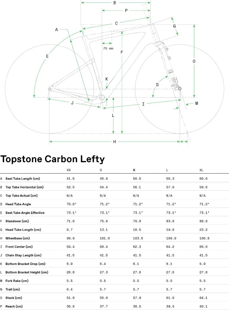 - Frame: Topstone Carbon, Kingpin suspension system, SmartSense compatible, Proportional Response construction, 12x142mm thru-axle, 27.2 dropper post ready, BSA 68mm threaded BB, DirectLine internal cable routing, removable fender bridge, multiple gear/bottle mounts