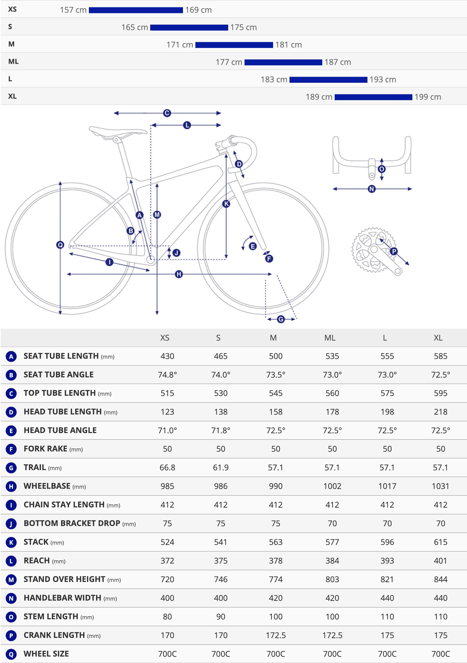 - Crankset: FSA Tempo, 34/50 XS:170mm, S:170mm, M:172.5mm, M/L:172.5mm, L:175mm, XL:175mm