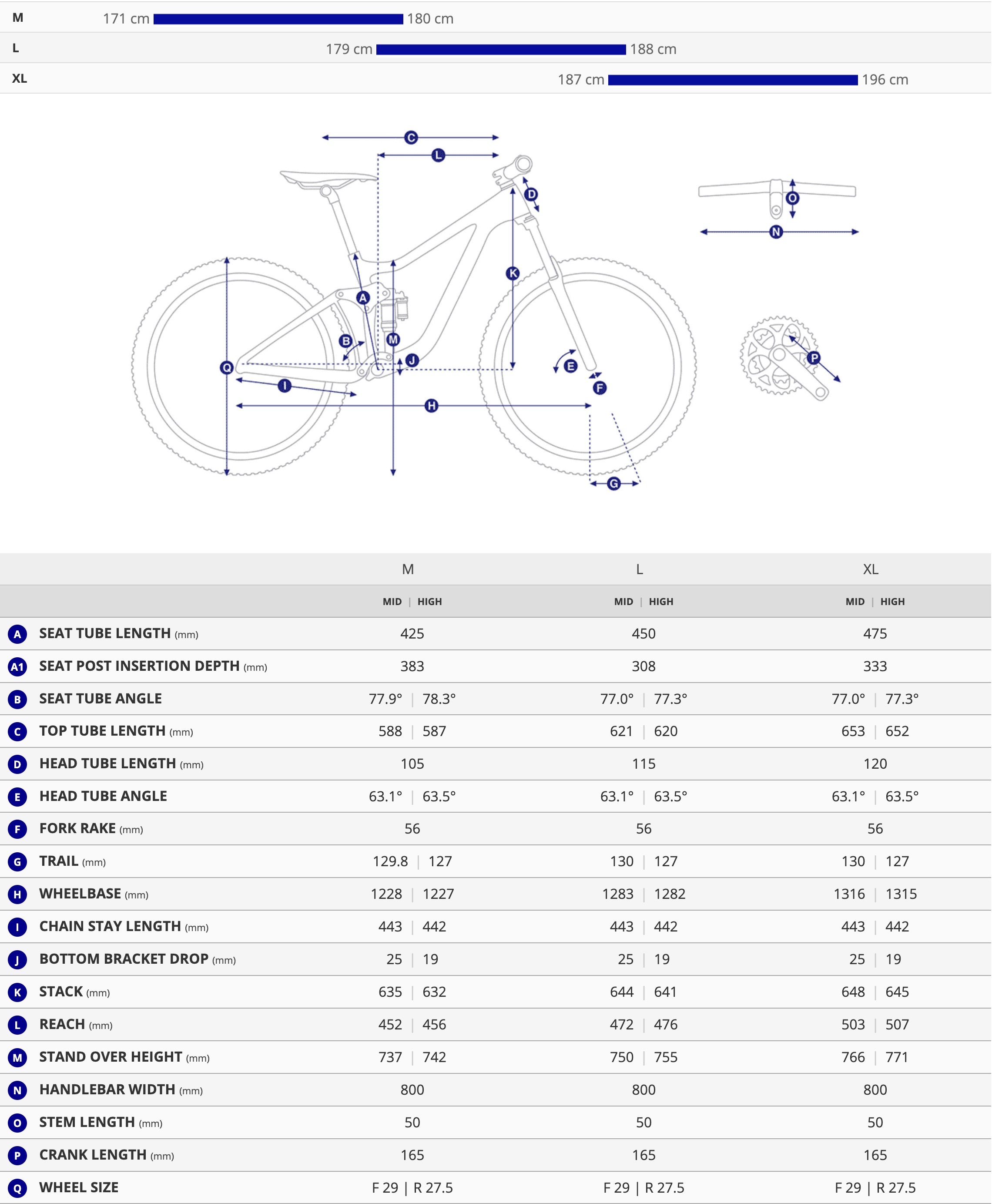 - Mixed wheel size: A 29-inch front wheel provides speed, stability and front-end control on rough, technical trails. A 27.5-inch rear wheel adds agility and maneuverability to help riders rail corners, pop over features and show off their style.