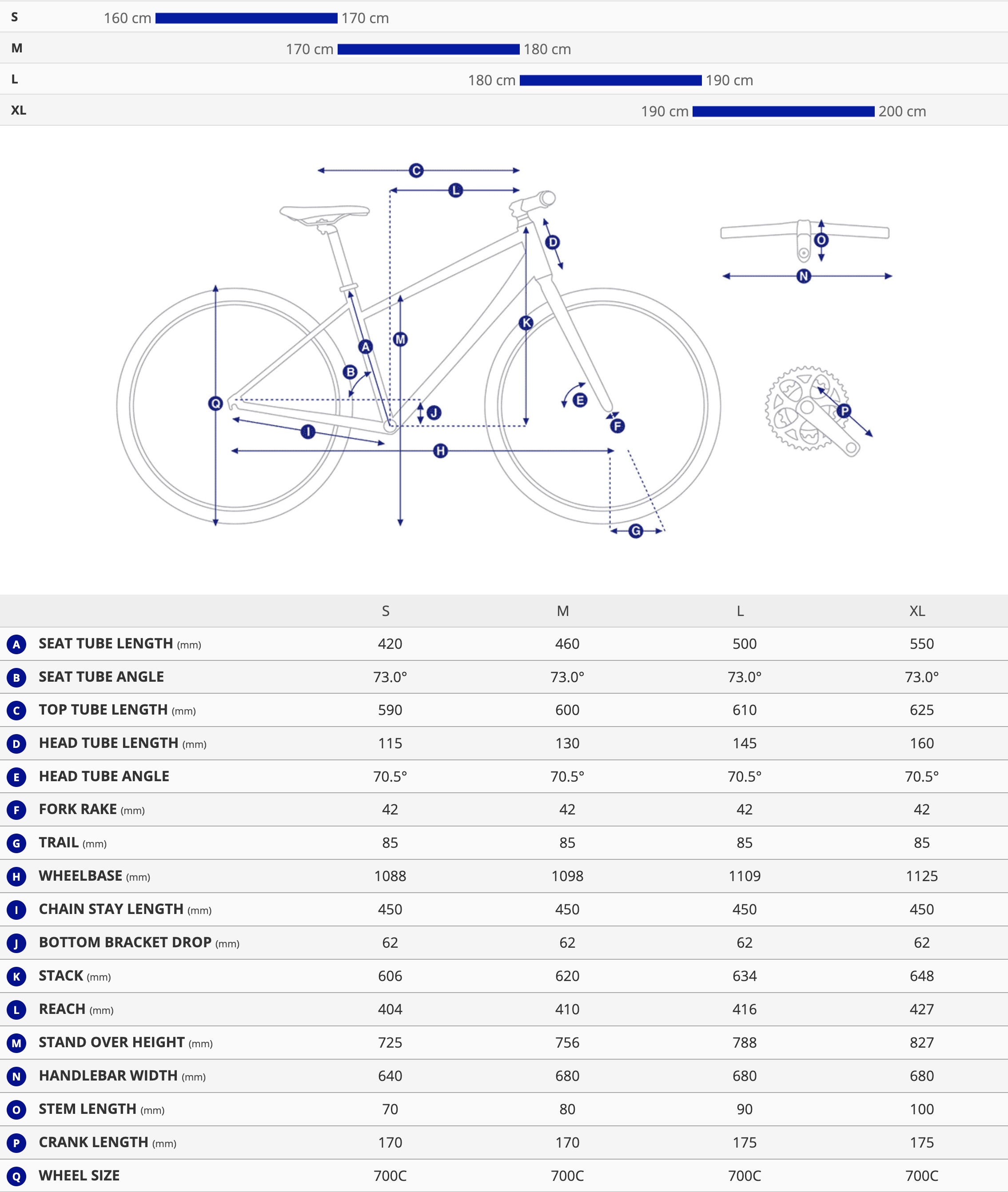 - Crankset: forged alloy, 30/46 S:170mm, M:170mm, L:175mm, XL:175mm