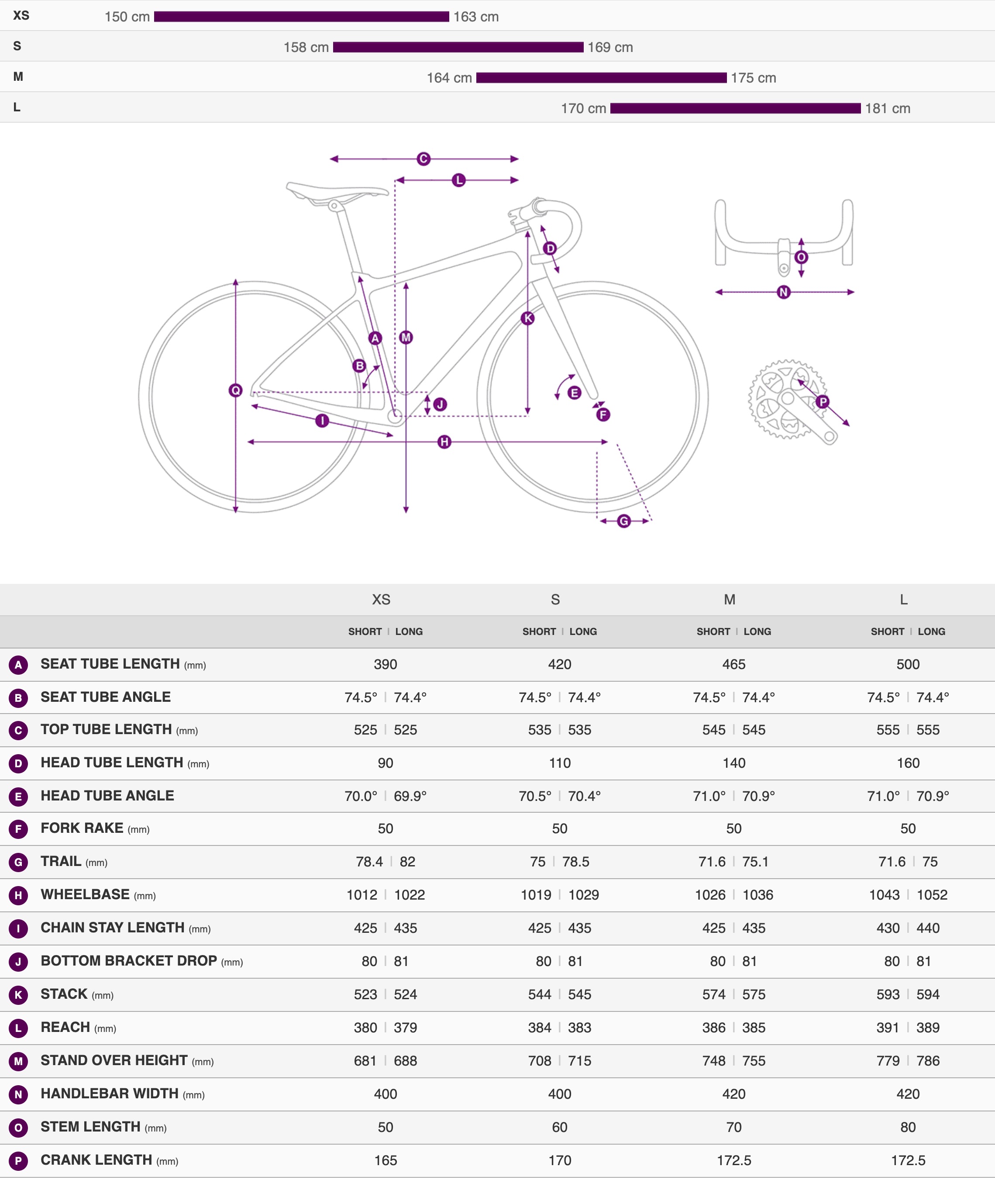 - Crankset: Shimano GRX RX-820, 31/48, XS: 165mm, S: 170mm, M: 172.5mm, L: 172.5mm
